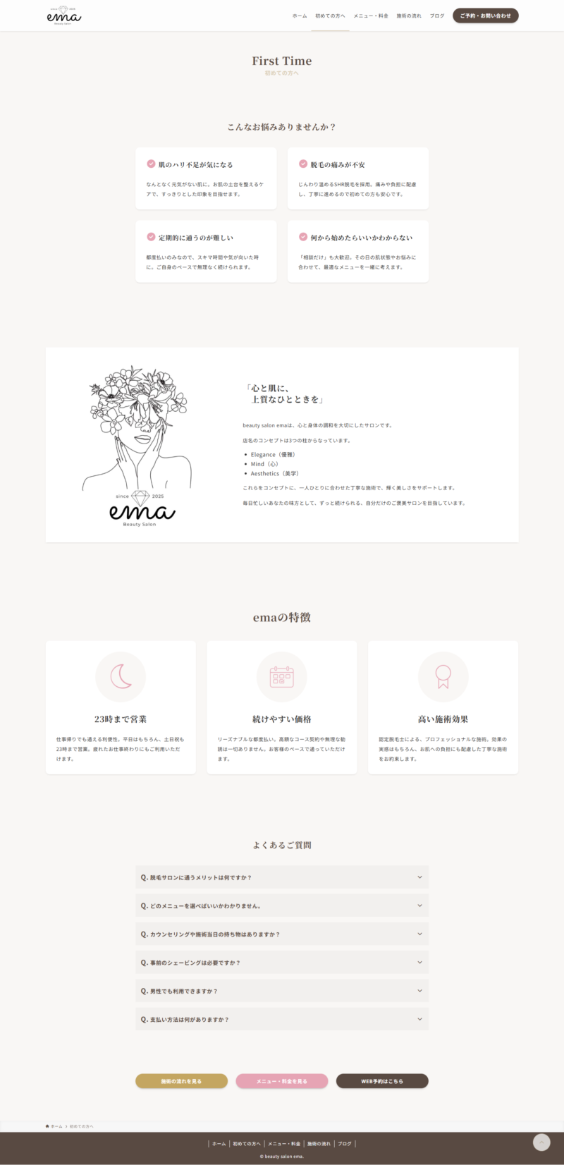 サロンが大切にしていることや特徴をお伝えし、「よくあるご質問」への回答を掲載することで、来店前の不安を優しく和らげています。